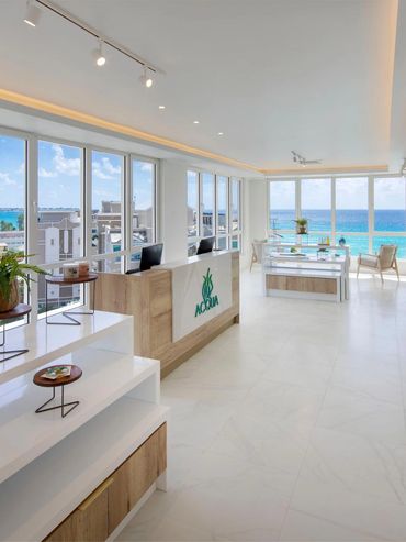 One of the most common types of baths is the Moroccan hammam steam room. This began our design process with the hammam room at the heart of the design and the use of the seaweed as an inspiration for our spaces. Acqua is located on the 8th floor of the building with views to the ocean from all rooms. We used a palette of white calacatta marble and distressed oak combined with gold accents.