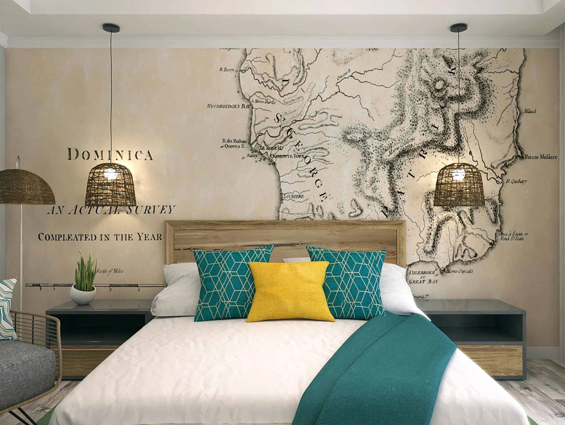 The site’s rich history, its breathtaking ocean and mountain views, along with Dominica’s impressive volcanic rock and pebbled beaches, inspired our design concept for theguest rooms.