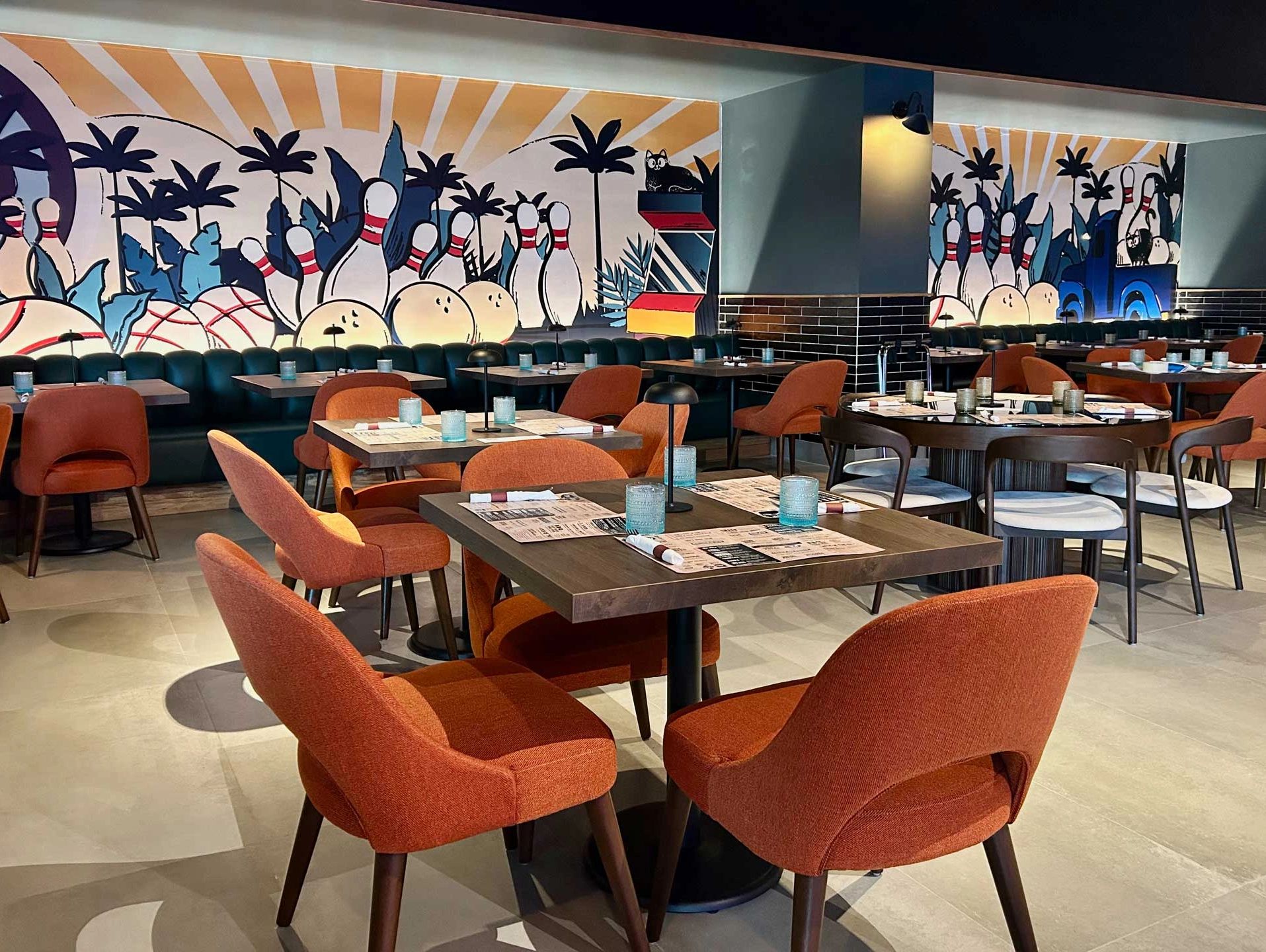 Retro-inspired touches—such as vintage lighting, neon signs, and bowling-themed décor—are balanced by clean, contemporary lines. The bowling lanes transition seamlessly into dining areas featuring plush seating and communal tables that encourage connection and socializing.