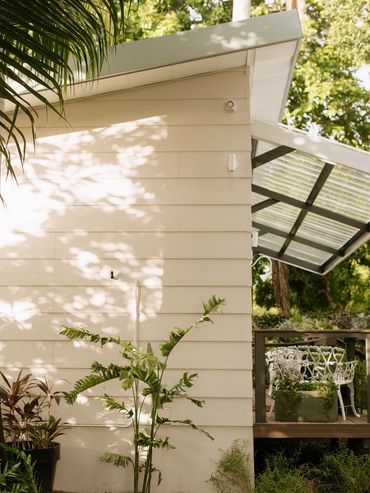 Featuring a white slat board exterior and natural interior elements of wood, raffia, and stone, it offers a serene space for healing. With skilled therapists providing light, warmth, and care, this two-room sanctuary nestled amongst the trees honors the client's father whose green thumb brought this space the healing power.